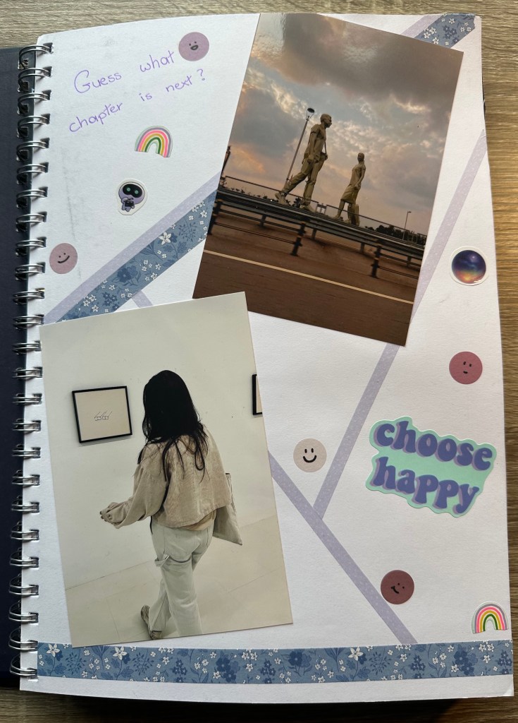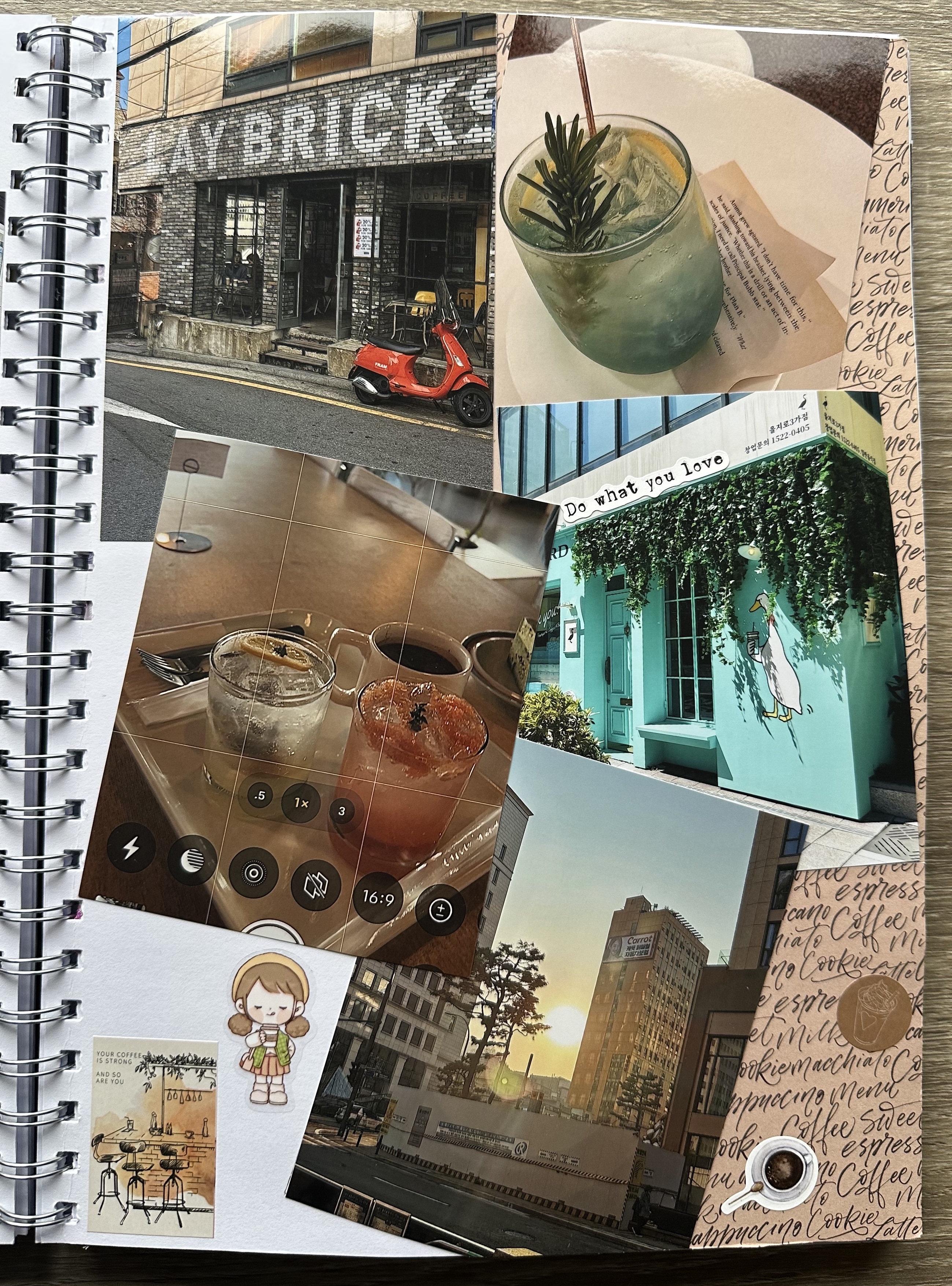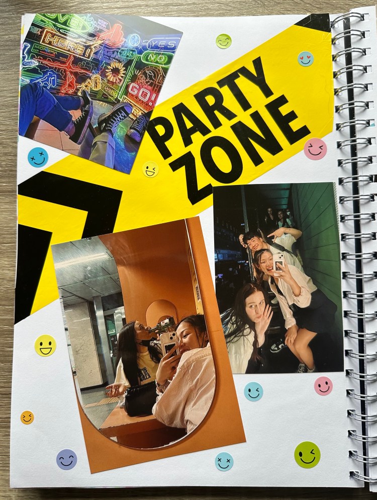 - Now for the fun part! Time to design your pages. Choose a group of photos you want to start with and see which pictures go well together (based on vibes or colors). Select which elements of your decorating items match the vibe/aesthetics/color of the images, and start arranging.